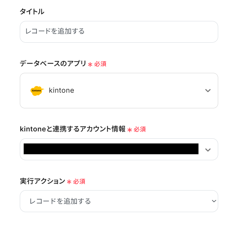 kintoneと連携するアカウント情報はプルダウンから選択します。 アクションには「レコードを追加する」を選びましょう。