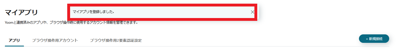 マイアプリ登録が成功すると、以下の画面が表示されます。 マイアプリの画面にサスケWorksとkintoneのアイコンが表示されているか確認してください。