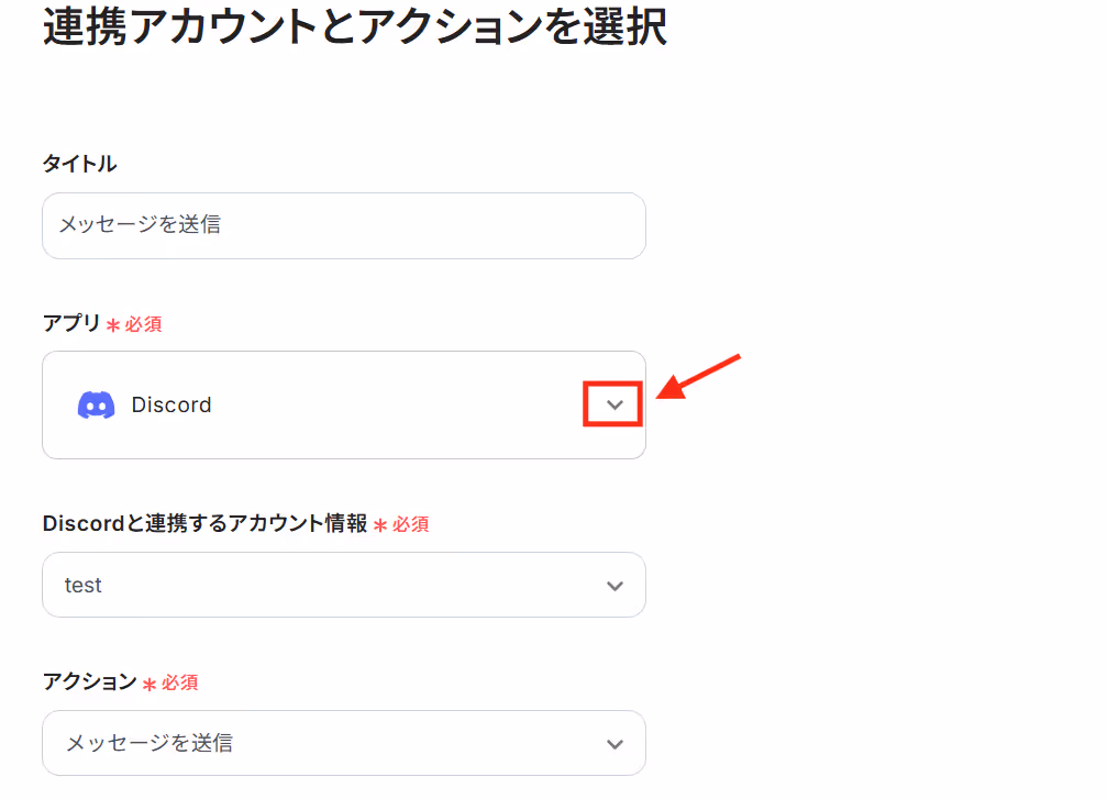 連携アカウントとアクションを選択画面でDiscordをクリックし、アプリ一覧からSlackやChatworkを選択して、該当のアクションを設定してください。