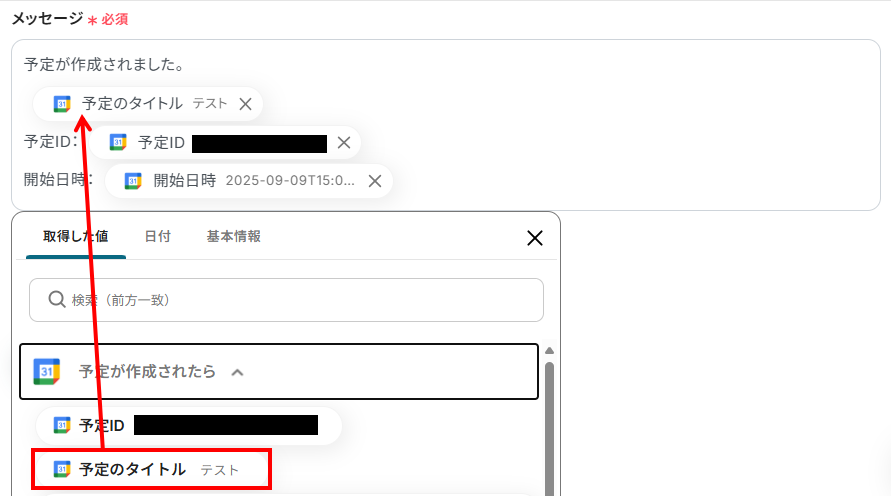 この「取得した値」を活用することで、値が固定化されずに毎回最新の予定情報をメッセージに反映可能です。