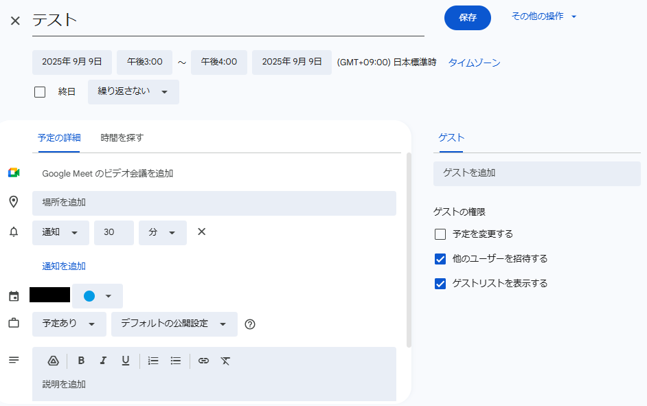 設定が完了したら動作チェックのためにテストを行いますので、Googleカレンダーにテスト用のイベントを作成してください。
