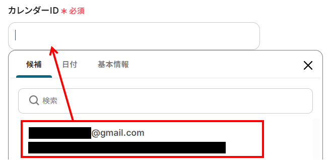 「カレンダーID」は、入力欄をクリックして表示される候補から選択します。