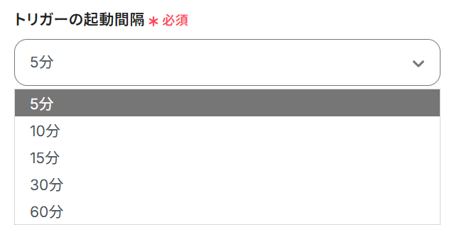 ・トリガーは5分、10分、15分、30分、60分の間隔で起動間隔を選択できます。
