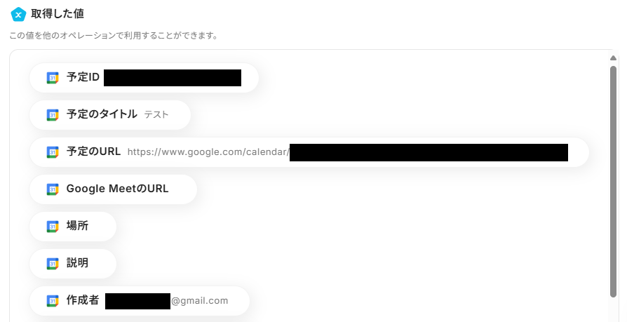 テストが成功すると、先ほど作成したイベントの情報が「取得した値」に反映されているはずなので、確認しましょう。