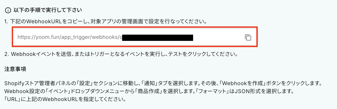 Webhookの設定は、Shopifyの管理画面で行いますので、下図赤枠内のURLをコピーしておき、Shopifyの画面に移動しましょう!