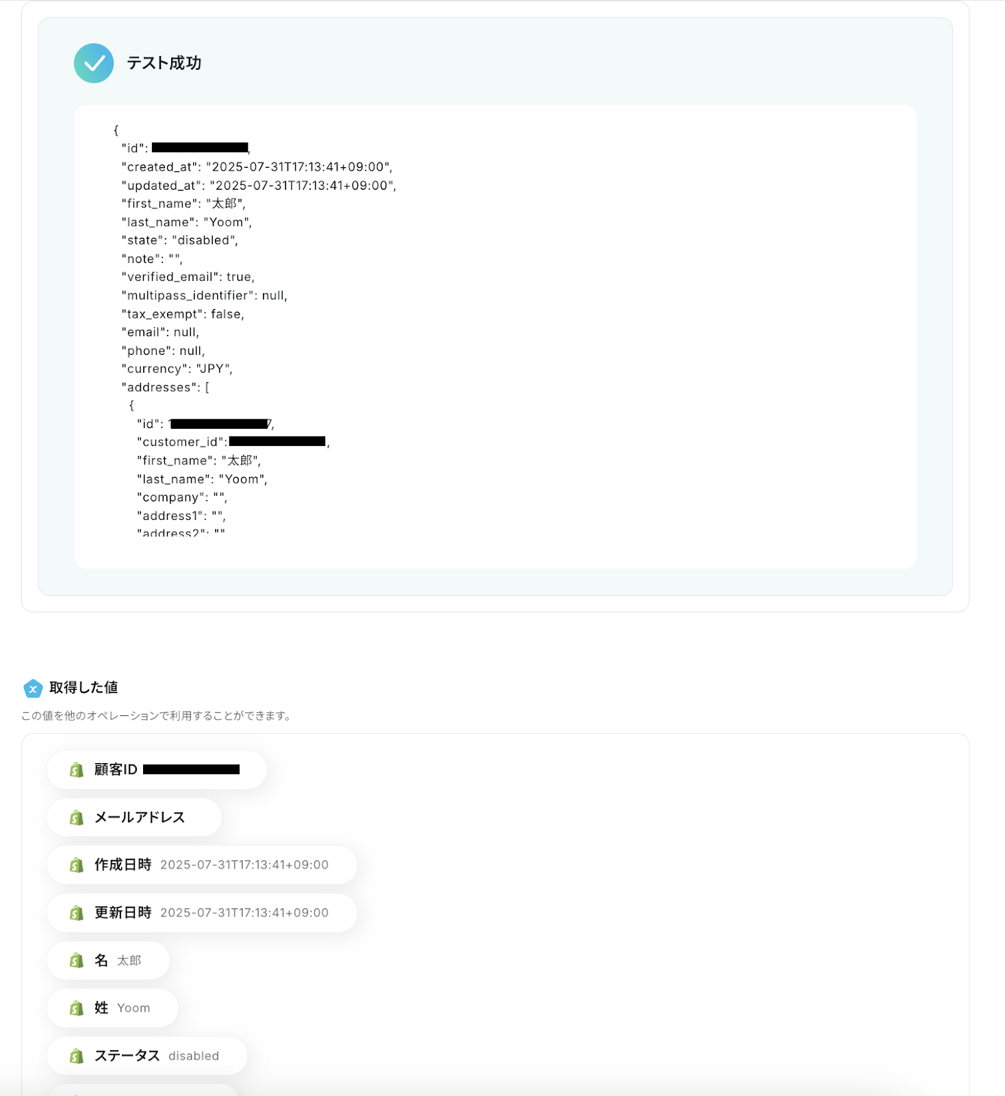 テストが成功すると、先ほど作成した顧客情報が「取得した値」にアウトプットとして抽出されるので、内容を確認しましょう。