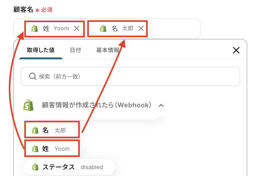 顧客名:ステップ3で取得したアウトプットを使って、下図のように設定します。