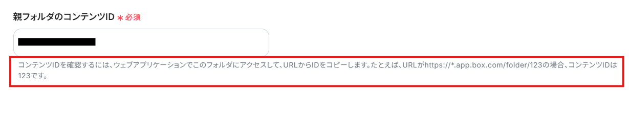 「親フォルダのコンテンツID」は、入力欄下の注釈に沿って、URLから取得して入力しましょう。