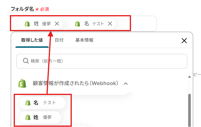 「フォルダ名」は、入力欄をクリックして表示される取得した値から選択してください。