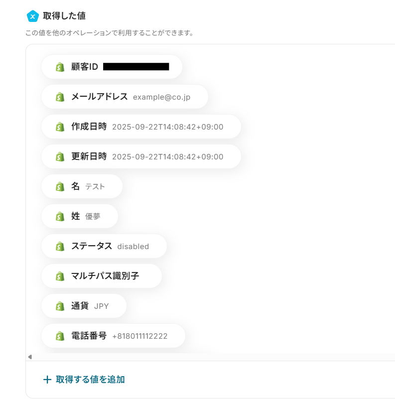 トリガーやオペレーション設定時に、「テスト」を実行して取得した値です。