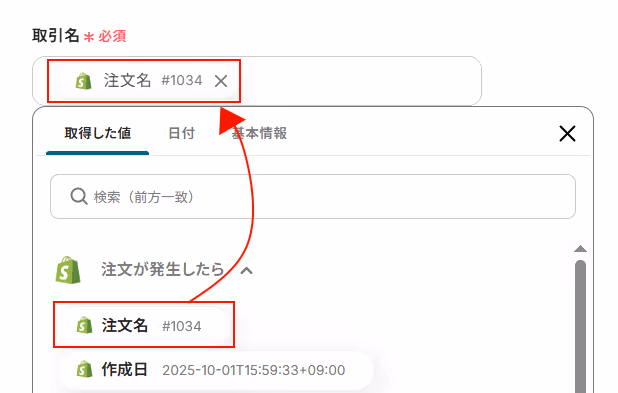 取引名にはデフォルトで取得した値の注文名が設定されています。