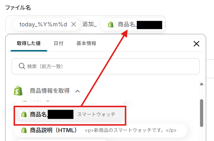 【Tips】 このように取得した値を活用することで、Shopifyで作成した商品情報を都度Google Driveへ連携できます。 なお、テキストを直接入力した部分は固定値として扱われるため、ご注意ください! 下記の画像のように入力すると、毎回「日付 追加_商品名」の規則に従ってファイル名が作成されます。