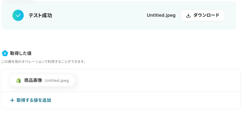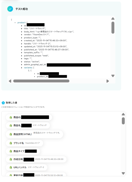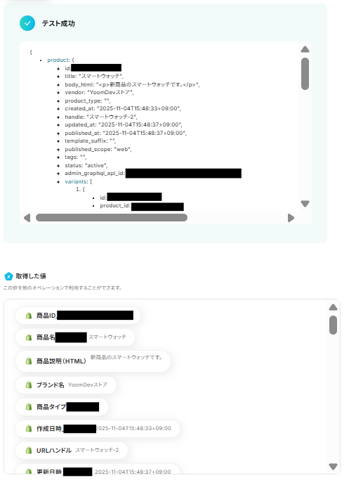 テストが成功すると取得した値の横に、Shopifyで作成した商品情報が表示されます。 「完了」をクリックして終了です!