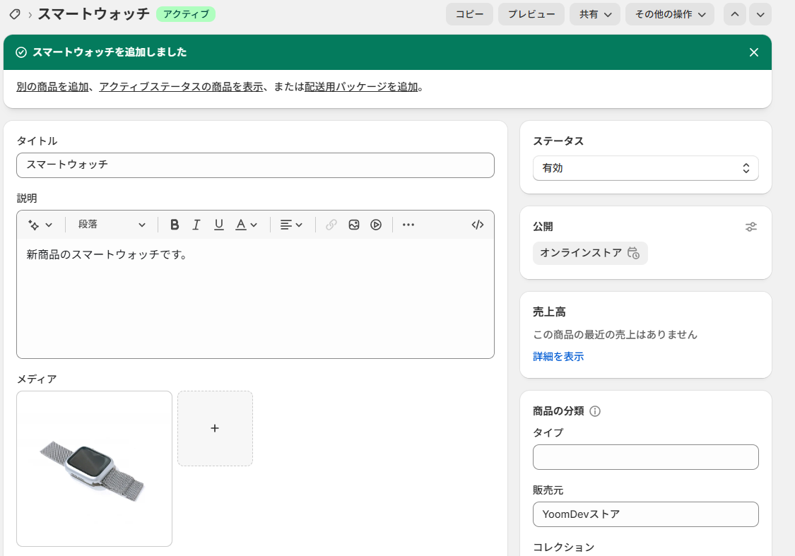 Webhookの設定が完了したら、テスト用に新しい商品を画像付きで作成します。