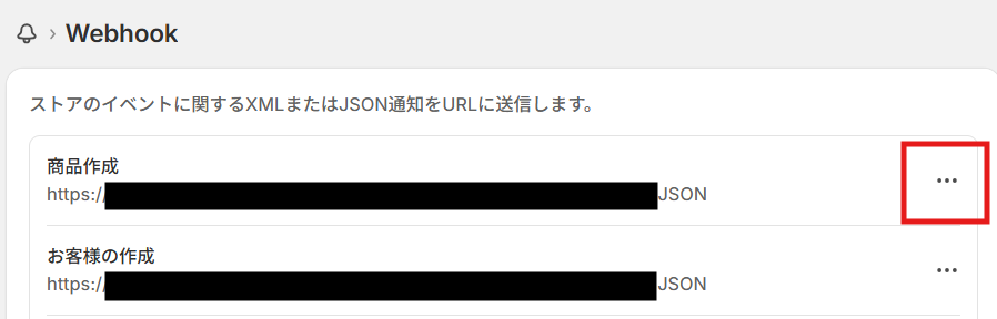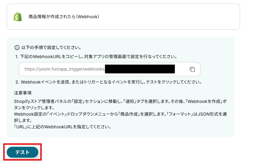 まずはShopifyのアクションをYoomに連携するために、Webhookの設定を行います。 赤枠内をクリックしてWebhookURLをコピーしたら、Shopifyに移動してください。