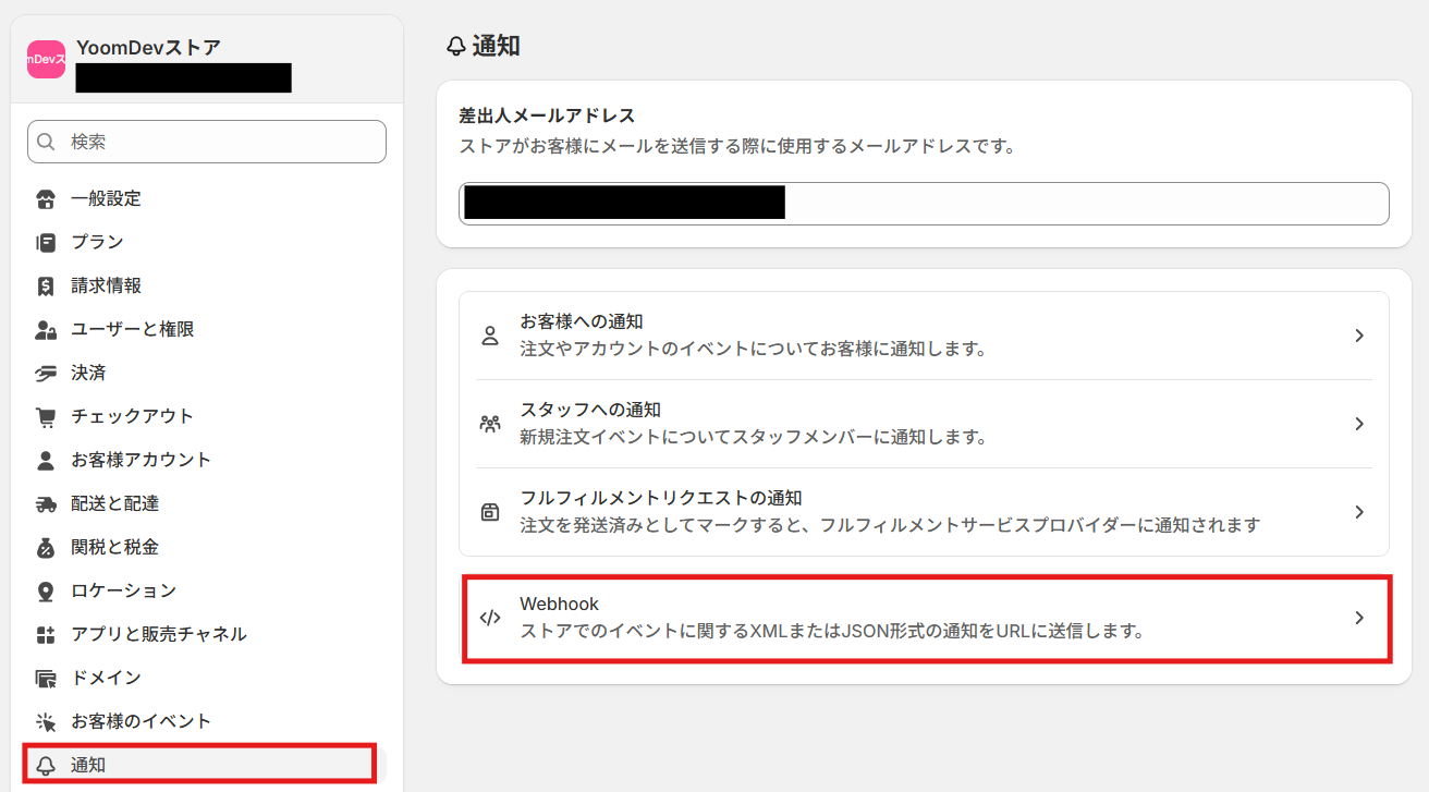 Shopifyにログインしたら設定セクションを選択し、「通知」から「Webhook」を選びます。