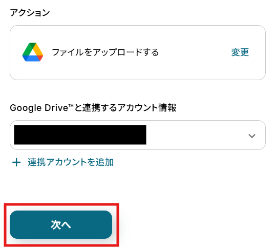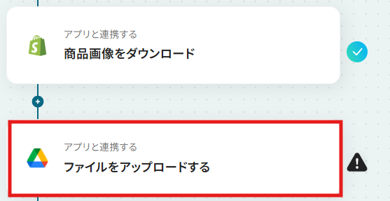 最後に、ダウンロードした商品画像をGoogle Driveに自動で保存する設定を行います。 「ファイルをアップロードする」をクリックしてください。