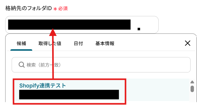 編集欄をクリックすると、連携したGoogle Driveアカウントのフォルダの候補が表示されます。 その中から、連携させたいフォルダを選択してください。 選択すると、自動でフォルダIDが反映されます。