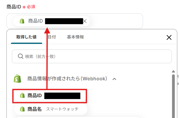 編集欄をクリックし、「商品情報が作成されたら(Webhook)」から「商品ID」を選択します。 デフォルトで入力されている「←商品IDのアウトプットを設定してください」を削除して、「テスト」をクリックしてください。