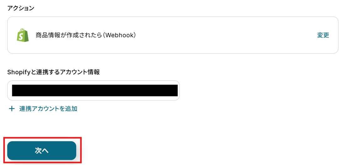 クリックすると以下の画面に移ります。 アカウント情報と書かれた項目にはステップ1でマイアプリ連携した際の情報が記載されています。 トリガーアクションは、「商品情報が作成されたら(Webhook)」のままで次に進みましょう!
