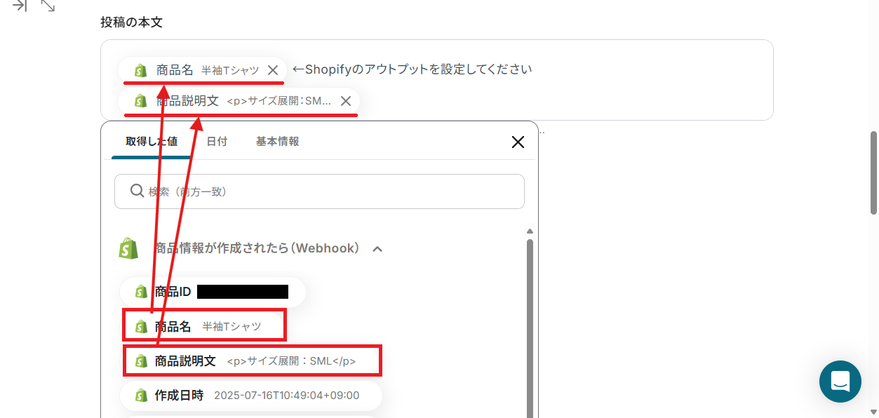 商品名はステップ3で取得したアウトプットがデフォルトで設定されています。