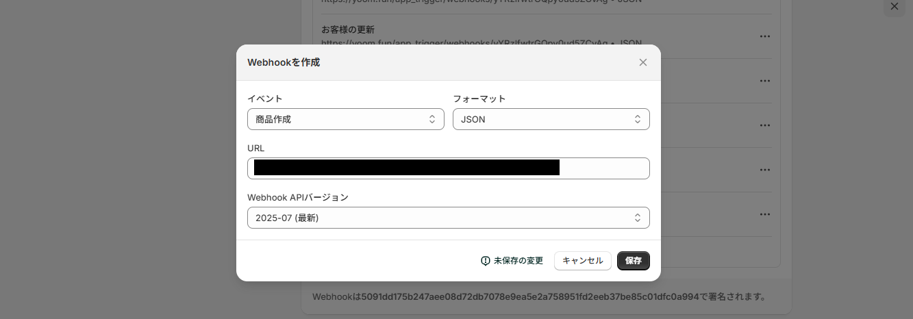 続いて、Webhookのイベント受信設定をShopifyの管理画面で設定していきます。