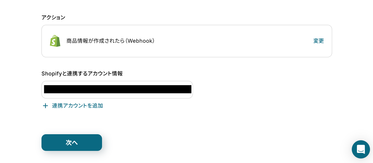 Shopifyと連携するアカウント情報は自動で設定されるので、確認し「次へ」ボタンを押してください。