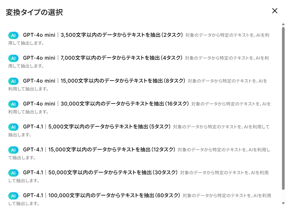 「変換タイプ」は、デフォルトで「GPT-4o mini|3,500文字以内のデータからテキストを抽出(2タスク)」が設定されていますが、「変更する」から任意のものを選択可能です。