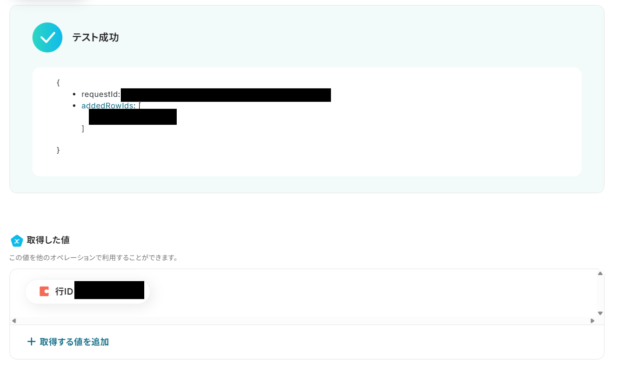 テストに成功すると「取得した値」に反映されます。詳しくは以下をご覧ください。