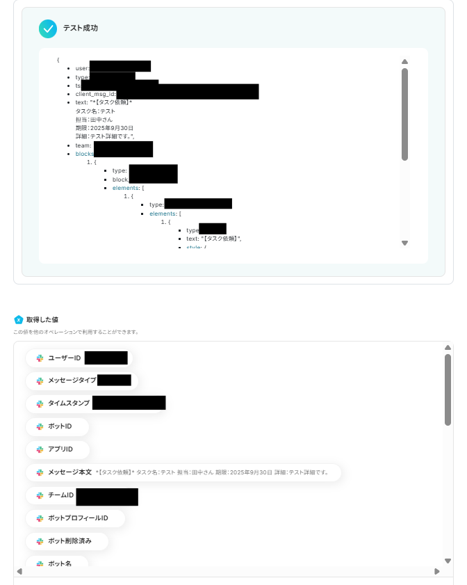 今回は例としてタスク管理を想定して、以下のメッセージを送信しました!