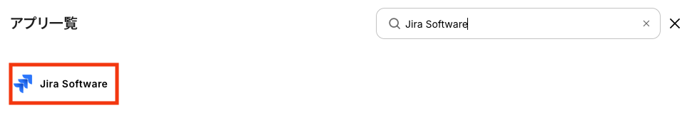 新規接続を押したあと、アプリのメニュー一覧が表示されるので Jira Softwareと検索し対象アプリをクリックしてください。