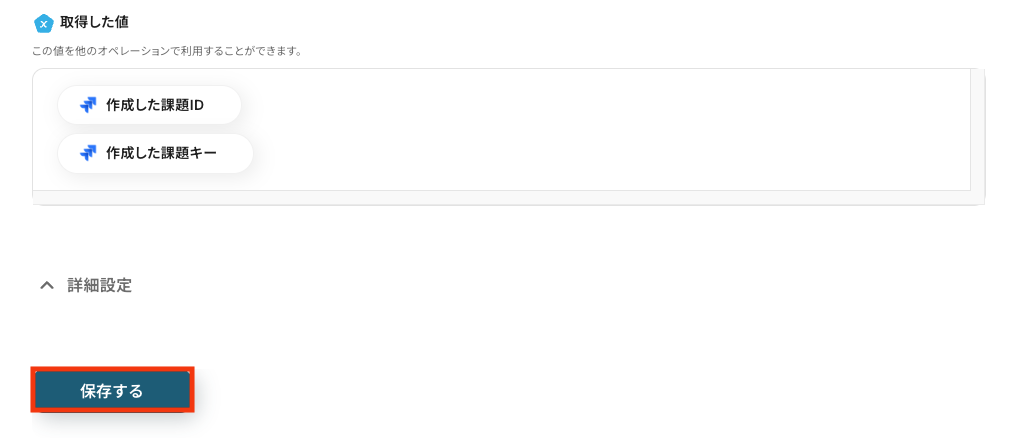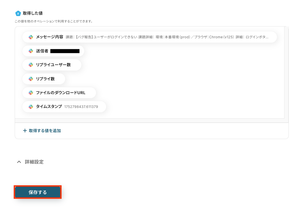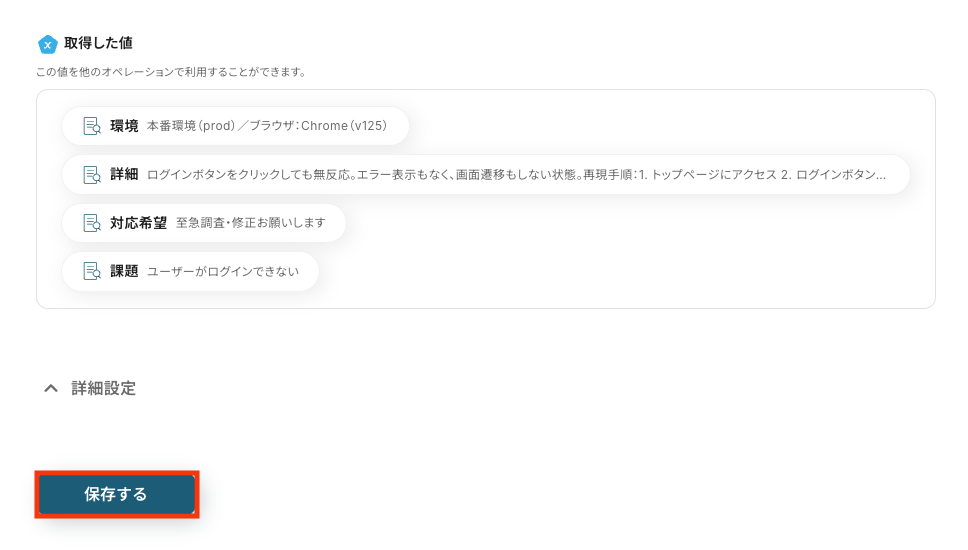 内容に問題がなければYoomの操作画面に戻り、取得した値を確認し、「保存する」をクリックします。