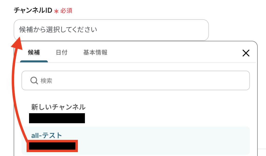 チャンネルID:入力欄をクリックすると、Slack連携済みのワークスペースから取得したチャンネルの一覧が候補として表示されます。