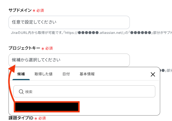 プロジェクトキー:入力欄をクリックすると候補が表示されるので、対象の項目を選択しましょう。