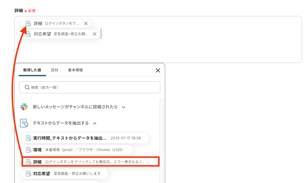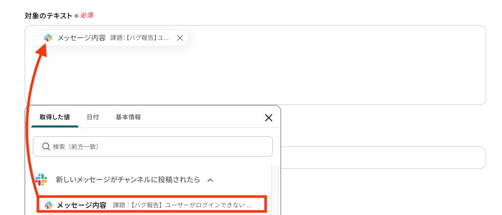 入力欄をクリックすると、前のステップでSlackから取得したアウトプットを使用できます。