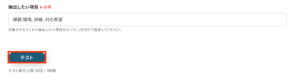 入力が完了したら、設定した項目が実際に正しく抽出されるかどうかを確認するため「テスト」をクリックします。