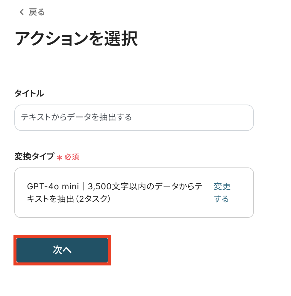 変換タイプ(GPT-4o mini|3,500文字以内のデータからテキストを抽出(2タスク)を選択したら、「次へ」をクリックします。