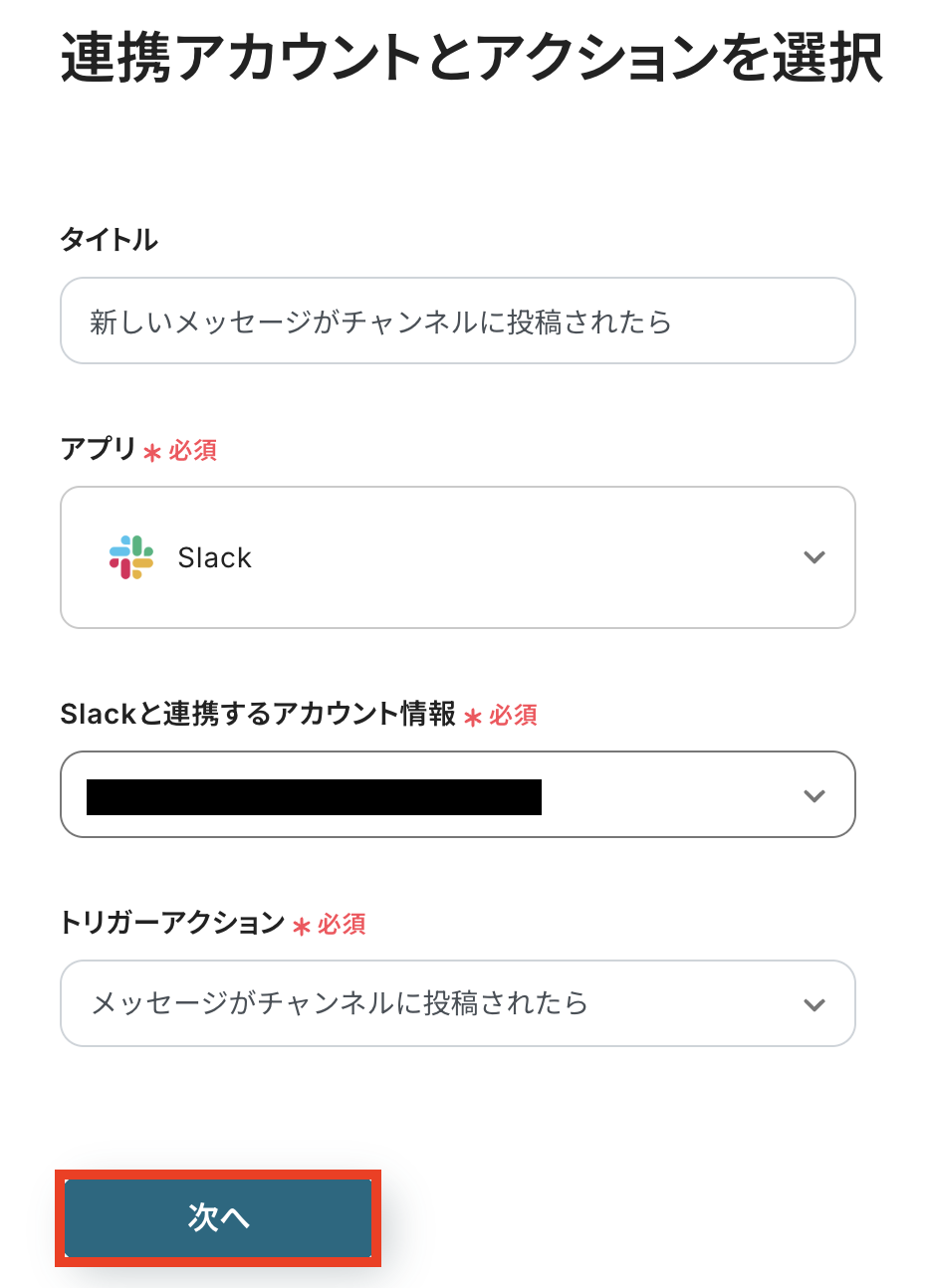 タイトルと連携するアカウント情報を設定し、アクションはテンプレート通りのまま「次へ」をクリックして進んでください。