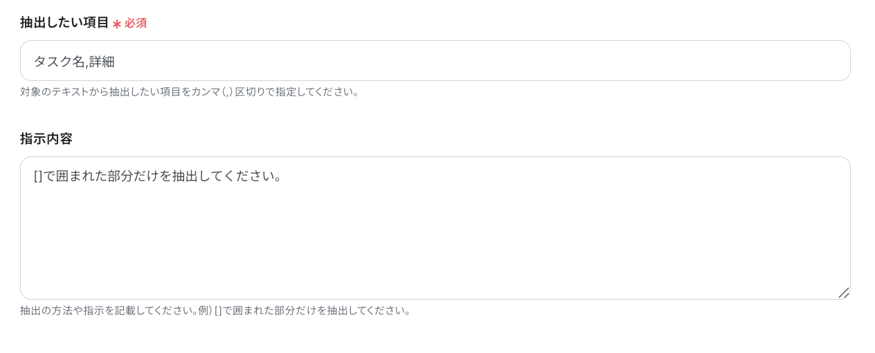今回は「抽出したい項目」や「指示内容」を以下のように設定して、フローボットを作成します。
