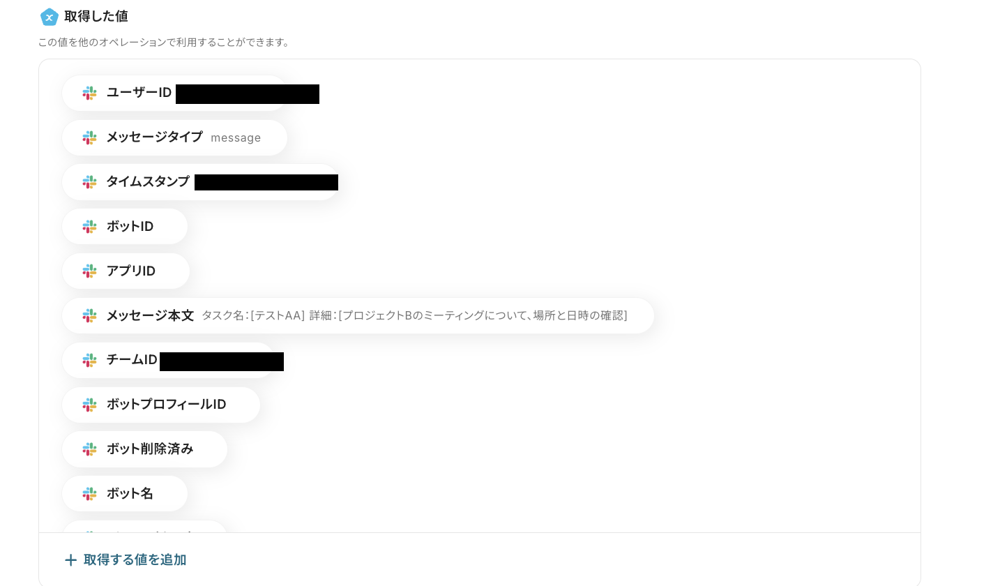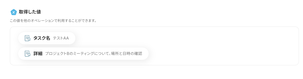 アウトプット情報は、「この値を他のオペレーションで利用することができます。」という注釈の通り、この後のステップで引用・活用できます。