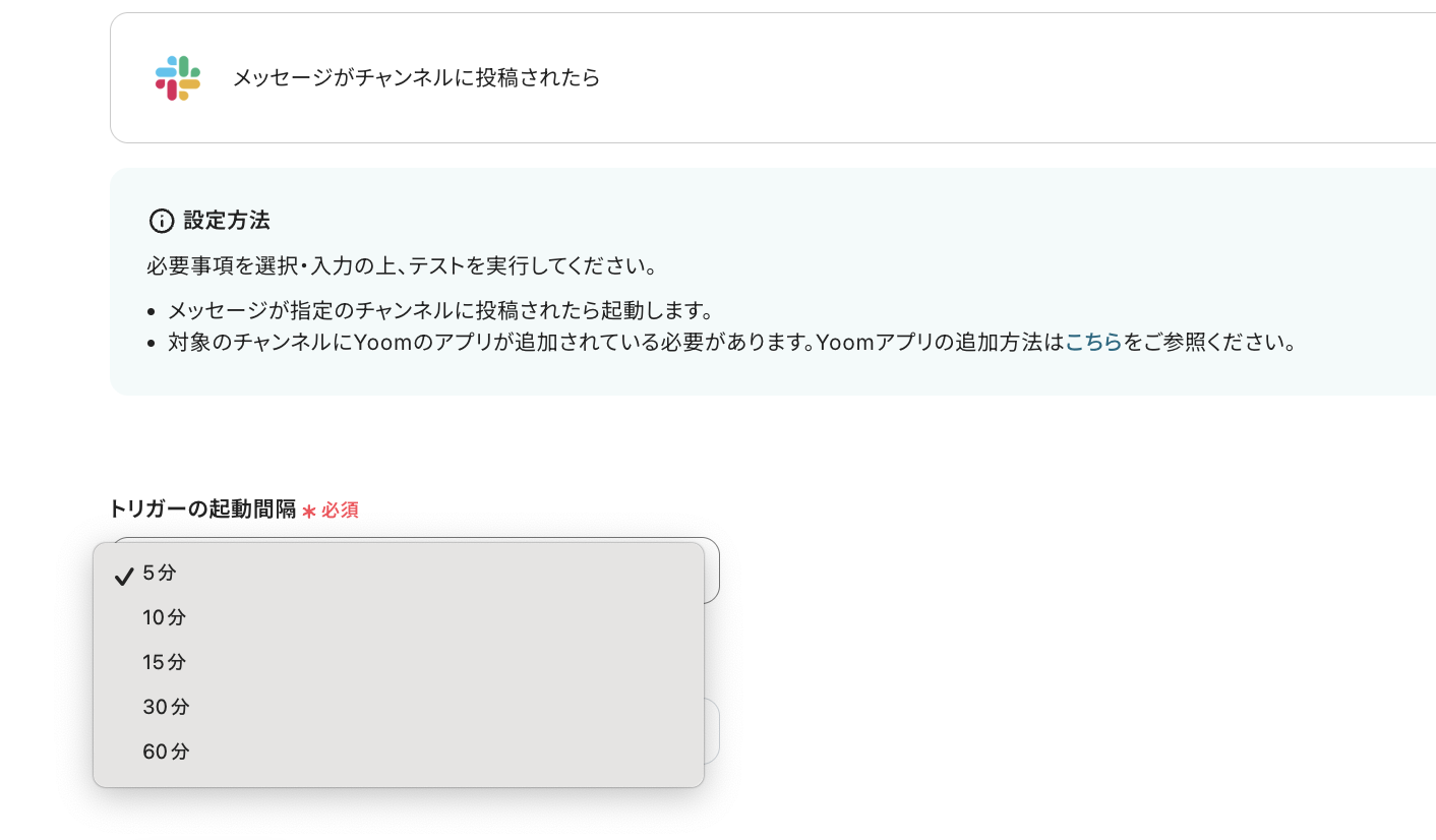 ・トリガーは5分、10分、15分、30分、60分の間隔で起動間隔を選択できます。