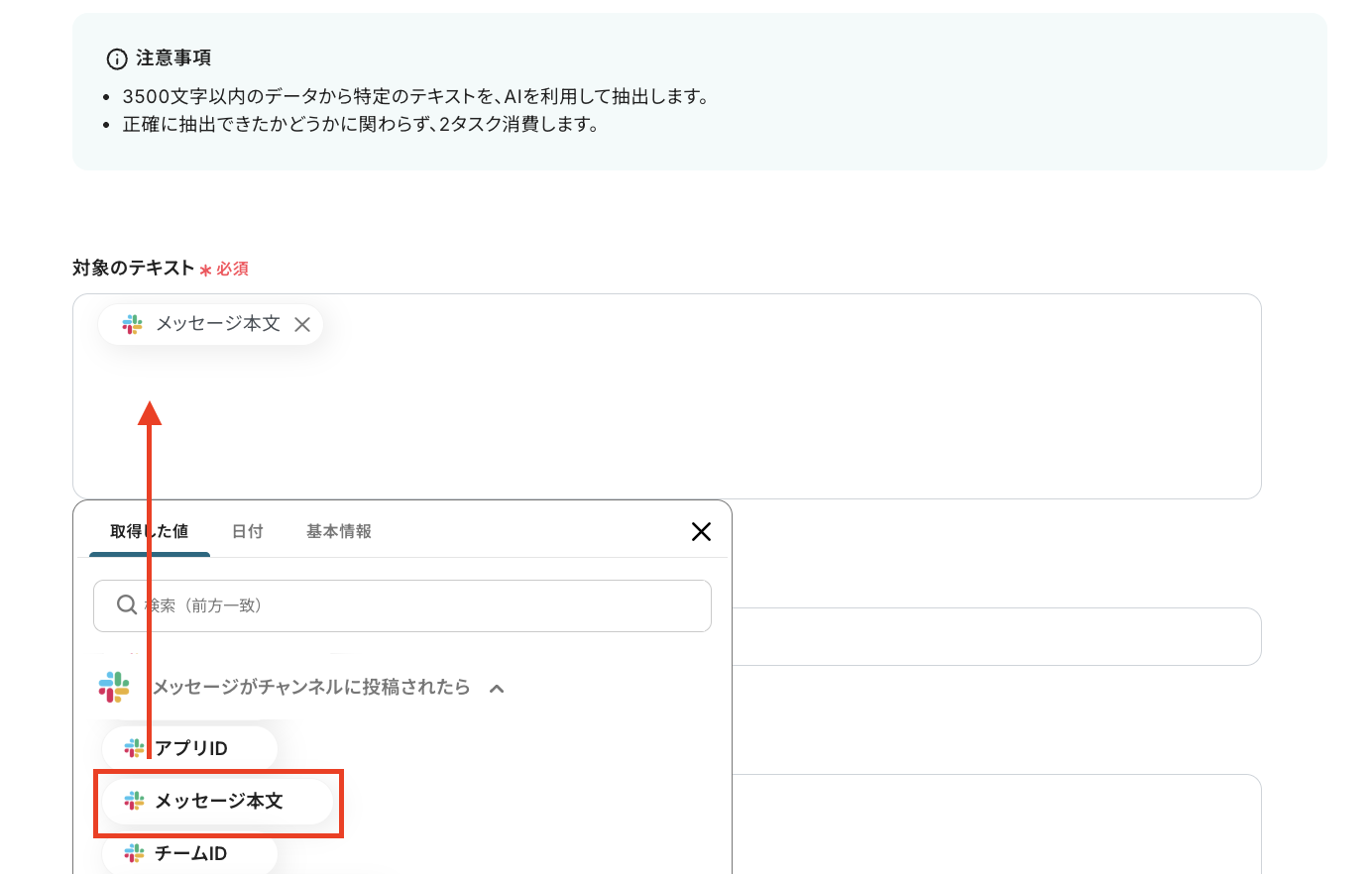 入力ボックスをクリックすると、前ステップから取得した情報をアウトプットとして引用できます。