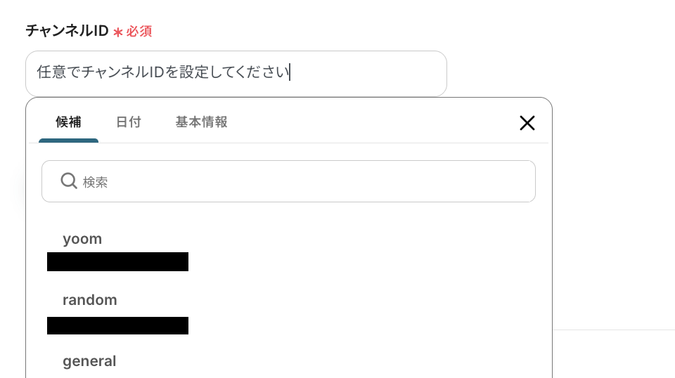入力バーをクリックすると、連携したアカウントに基づいたチャンネルが『候補』に表示されるので、運用に合わせて設定しましょう。