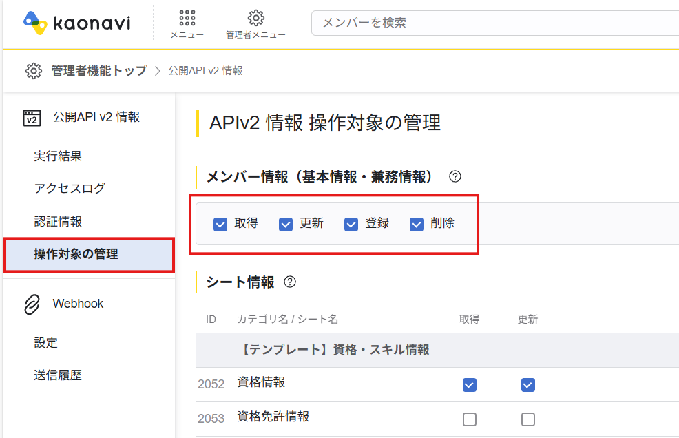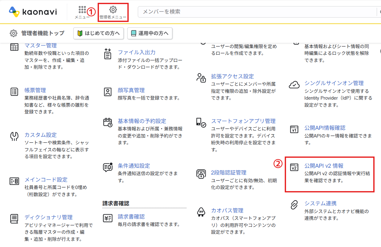 - カオナビにログインし、「管理者メニュー」の「公開API v2 情報」にアクセス。