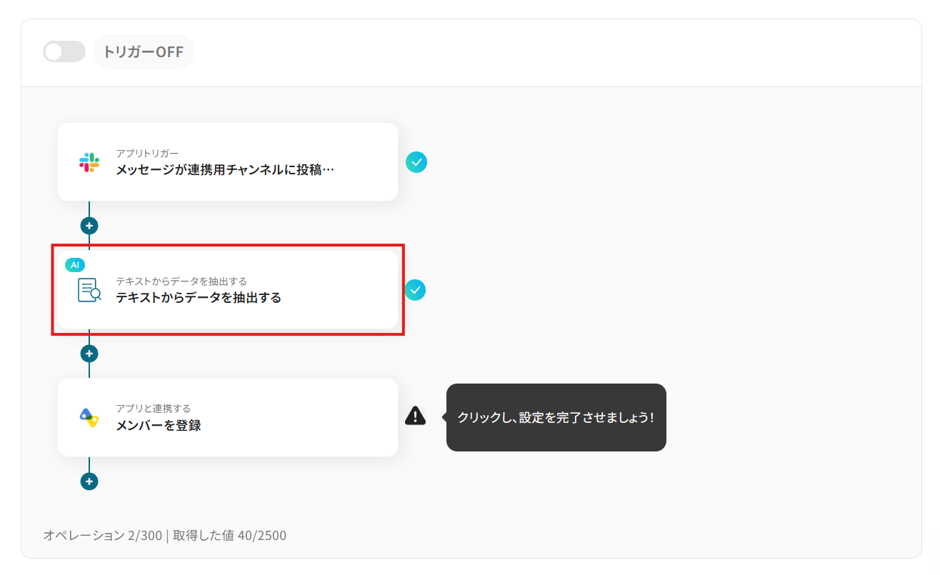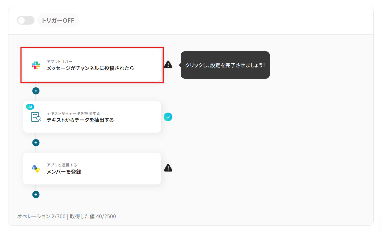 - トリガーとなるチャンネルと各アクション(テキスト抽出・メンバー登録)の設定