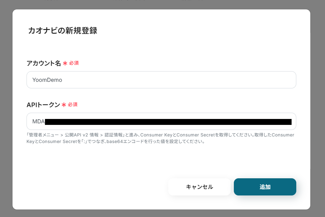 - Yoomに戻り、エンコードした値を「APIトークン」に設定。