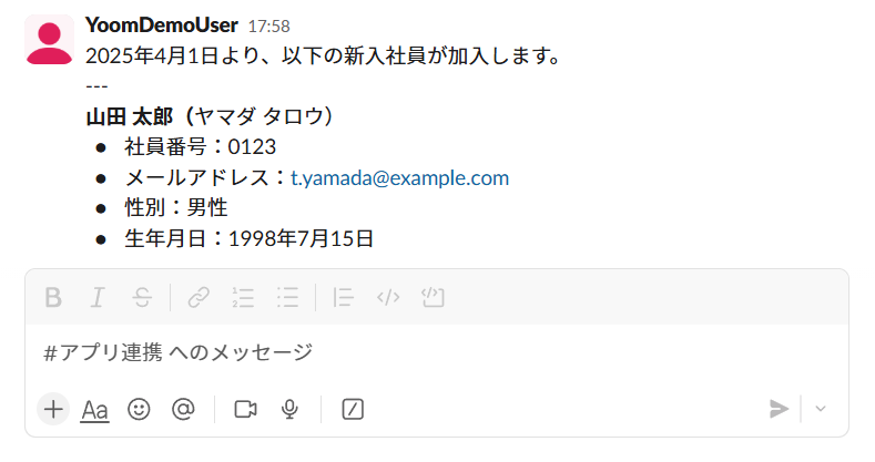 指定したチャンネルにメッセージを投稿し、そのメッセージから抽出された情報でカオナビにメンバーが登録されていれば成功です。