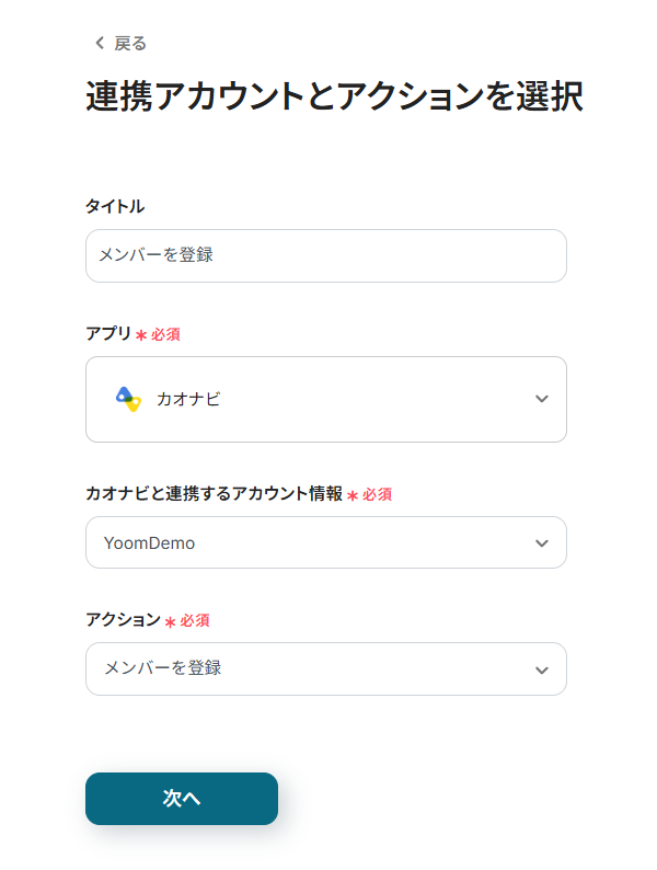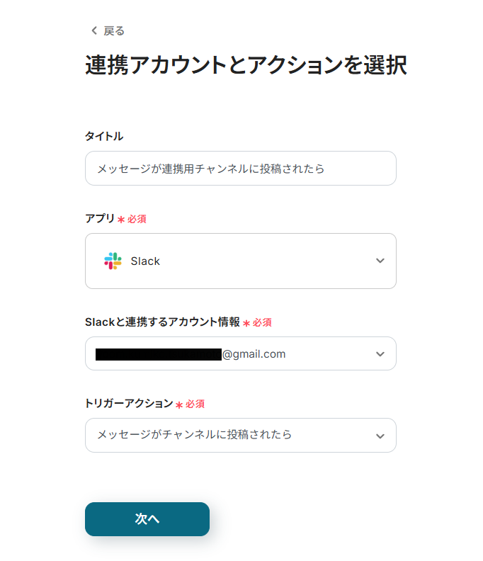 - 連携アカウントとアクションを確認し、「次へ」をクリック。