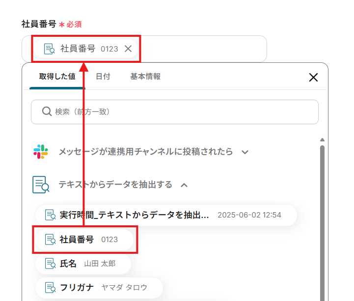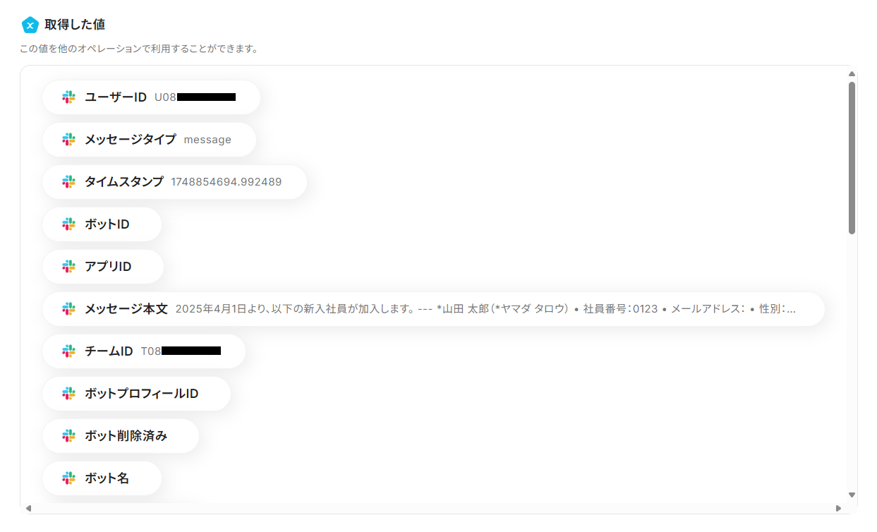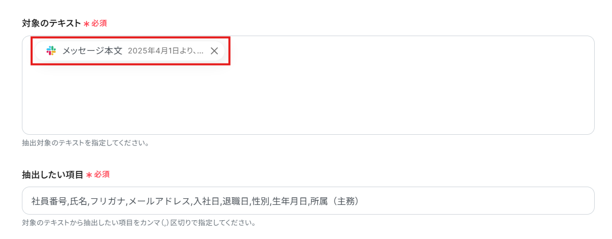 - 各項目にSlackのメッセージから抽出した値を設定していきましょう。