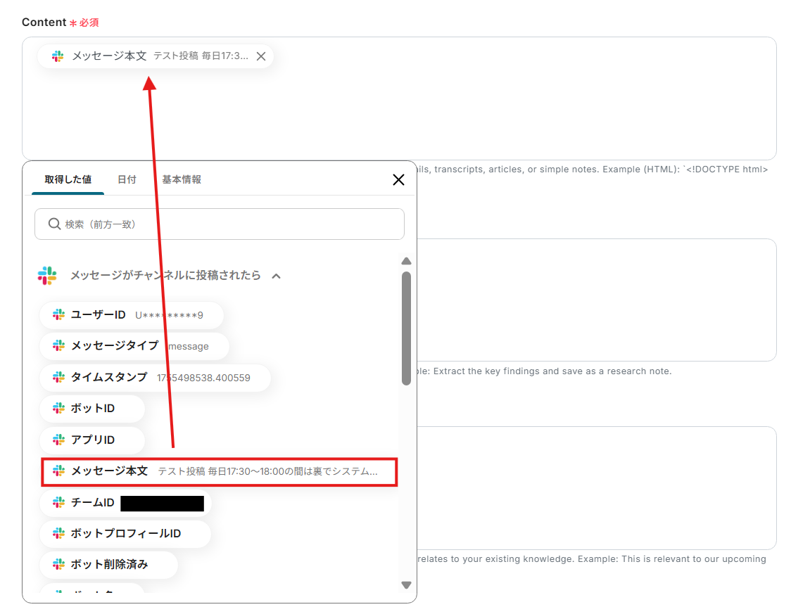 Content:Memに保存する内容を入力しましょう。プルダウンより1つ前のステップで取得したSlackの情報も設定可能です。 取得した値を活用することで、固定値ではなく、トリガーが実行されるたびに最新の情報が反映できます。